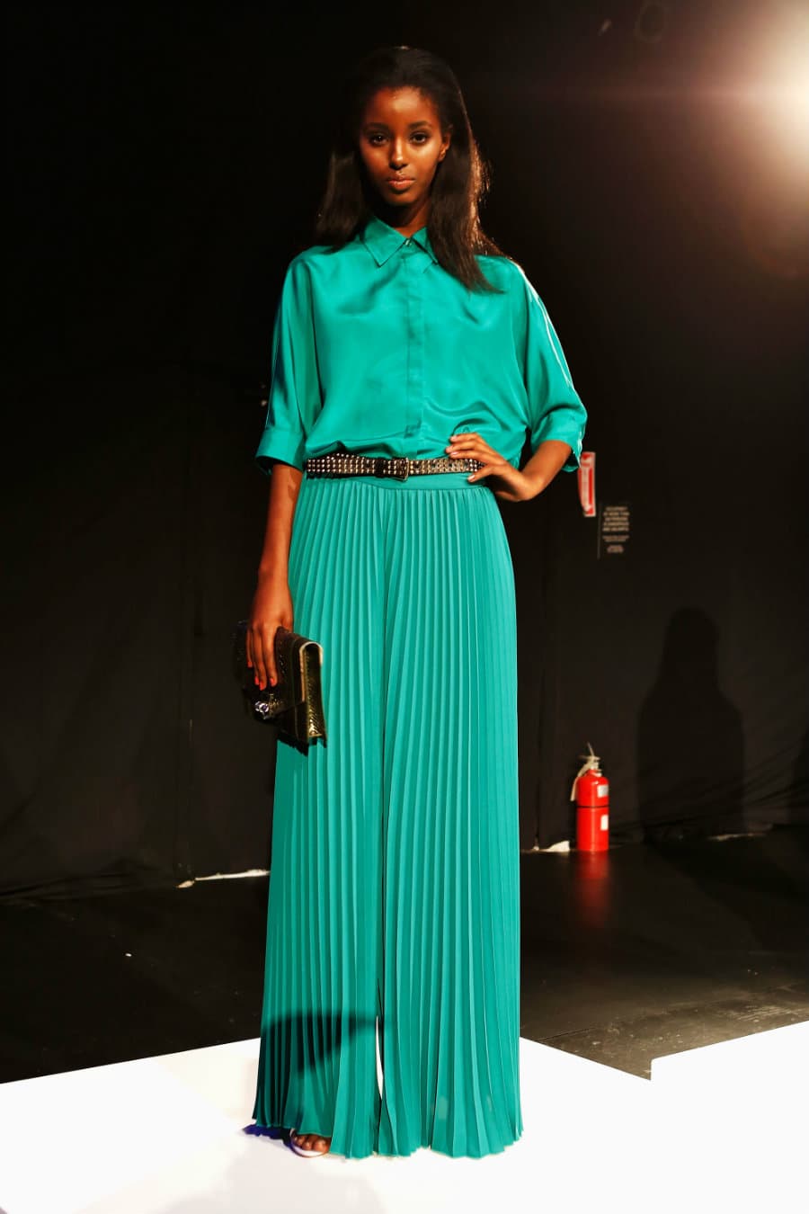 Me encanta lo llamativo de este atuendo, no luce recargado porque el cinto negro con tachas le da el corte perfecto junto al sobre negro haciendo juego. ¡Un look ideal para cualquier estación!