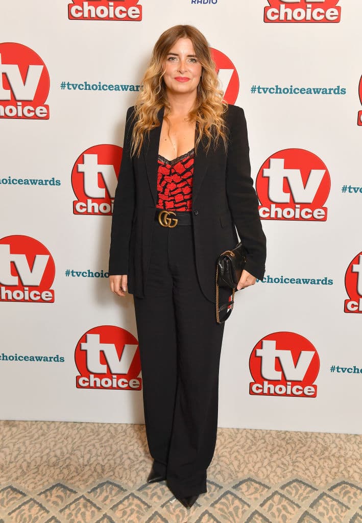 Los chalecos son una tendencia en trajes para la oficina. Kristina Rihanoff se quitó el tradicional saco sastre y apostó por un chaleco largo para esta ocasión. Cabe resaltar el detalle del cierre lateral, una añadidura brillante que se complementa muy bien con la textura de la prenda superior.