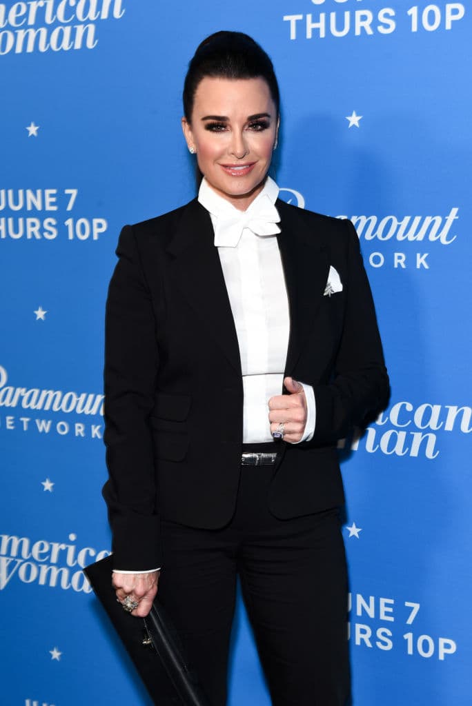 Últimamente los tuxedos femeninos están en tendencia, ¿ya has probado alguno? Si crees que no son lo tuyo, sólo mira a Kyle Richards con ese majestuoso look complementado con cartera larga.