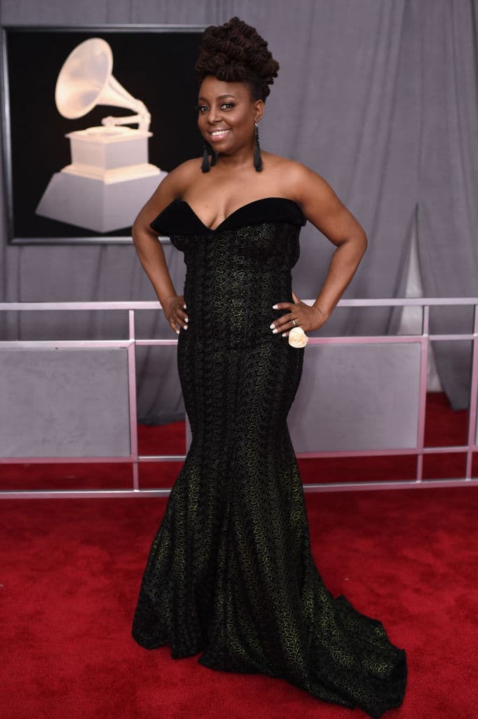 Una prueba más de que el corte sirena y el negro son una combinación ganadora para cualquiera. Aquí, la compositora de jazz Ledisi optó por un modelo con detalles tornasol que favorecieron su figura.