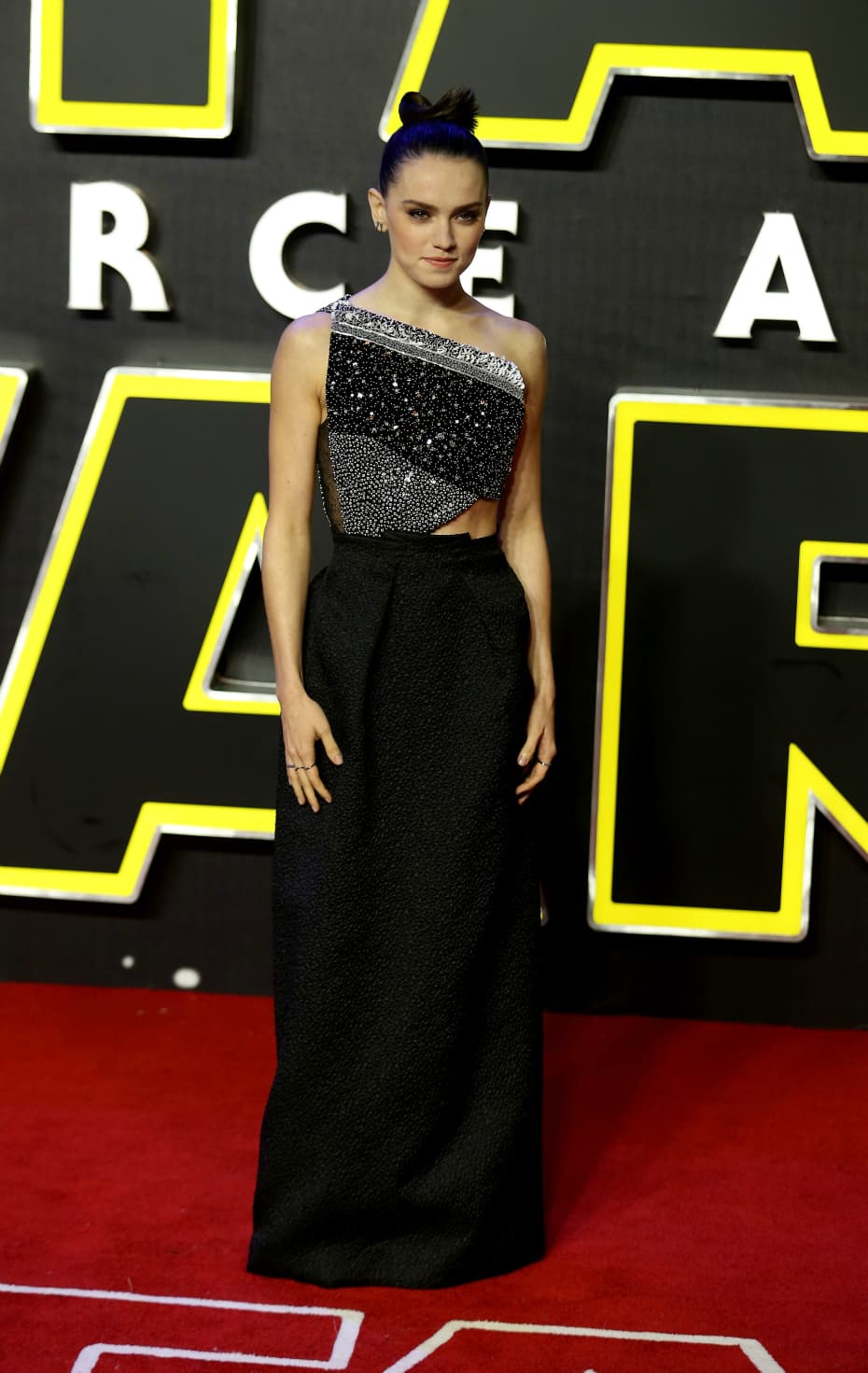Daisy Ridley también elige looks estructurales y asimétricos como este elegante vestido negro con detalles metalizados y con brillos.