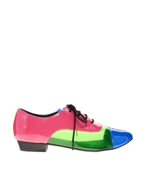 Otra opción si buscas algo descontracturado y diferente para tus looks es optar por colores fuertes y llamativos. O incluso combinarlos todos como en este zapato oxford de Yru, súper originales.
