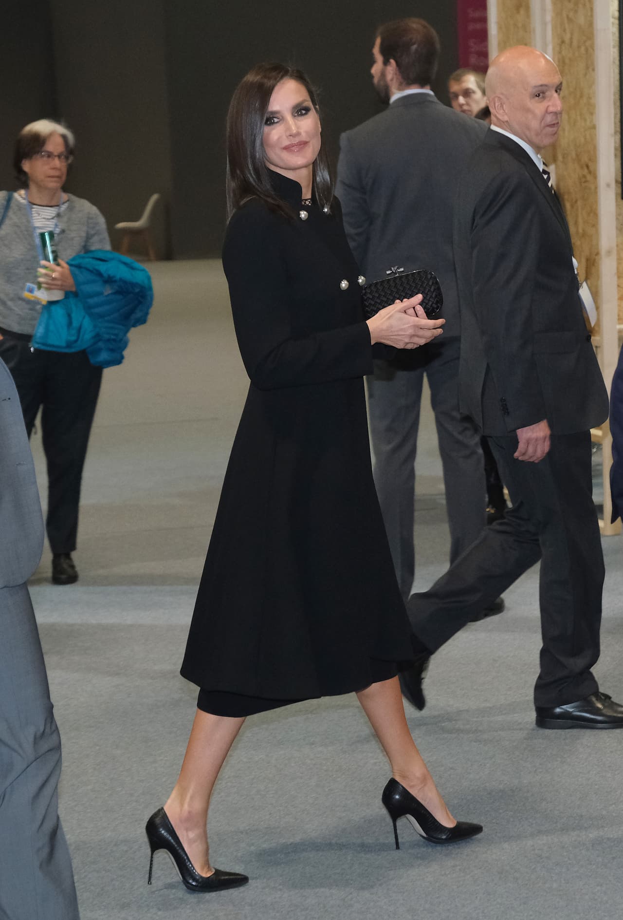 Durante la Conferencia de las Naciones Unidas sobre el Cambio Climático de 2019, la reina llevó un abrigo estilo militar en color negro, con tacones en el mismo tono para combinar perfectamente su outfit.