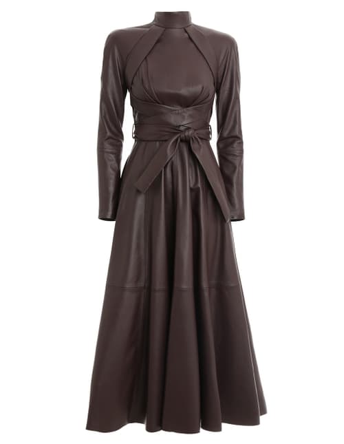 Se trató de un vestido de piel en color caoba, el cual tiene un costo de 3,750 dólares y pertenece al diseñador Zimmermann. Con un cuello alto, mangas y falda largas, Jennifer se vio recatada. Pero las cintas alrededor de su cintura la definieron, así como las líneas a los costados de su busto.