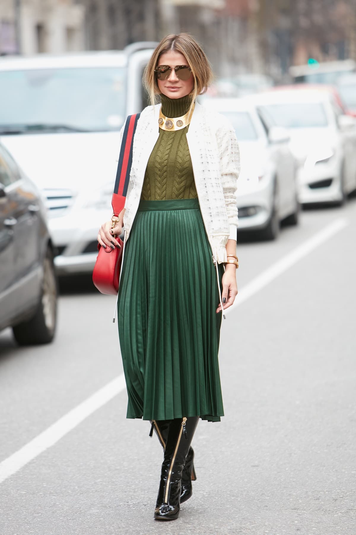 ¿Quién dice que en otoño no se pueden usar faldas? Aprovecha la gran diversidad de diseños que hay en las tiendas para adquirir una plisada color verde botella. Puedes compensar el frío agregando unas botas altas.
