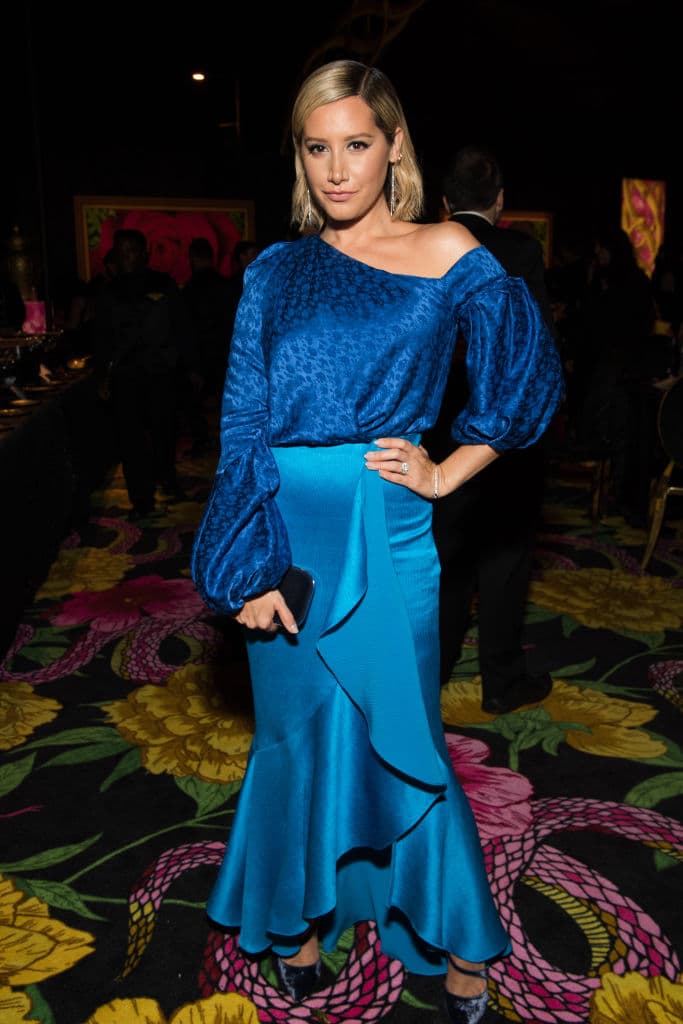El color escogido por Ashley Tisdale fue el azul en una pollera con volados y camisa con hombro al descubierto.