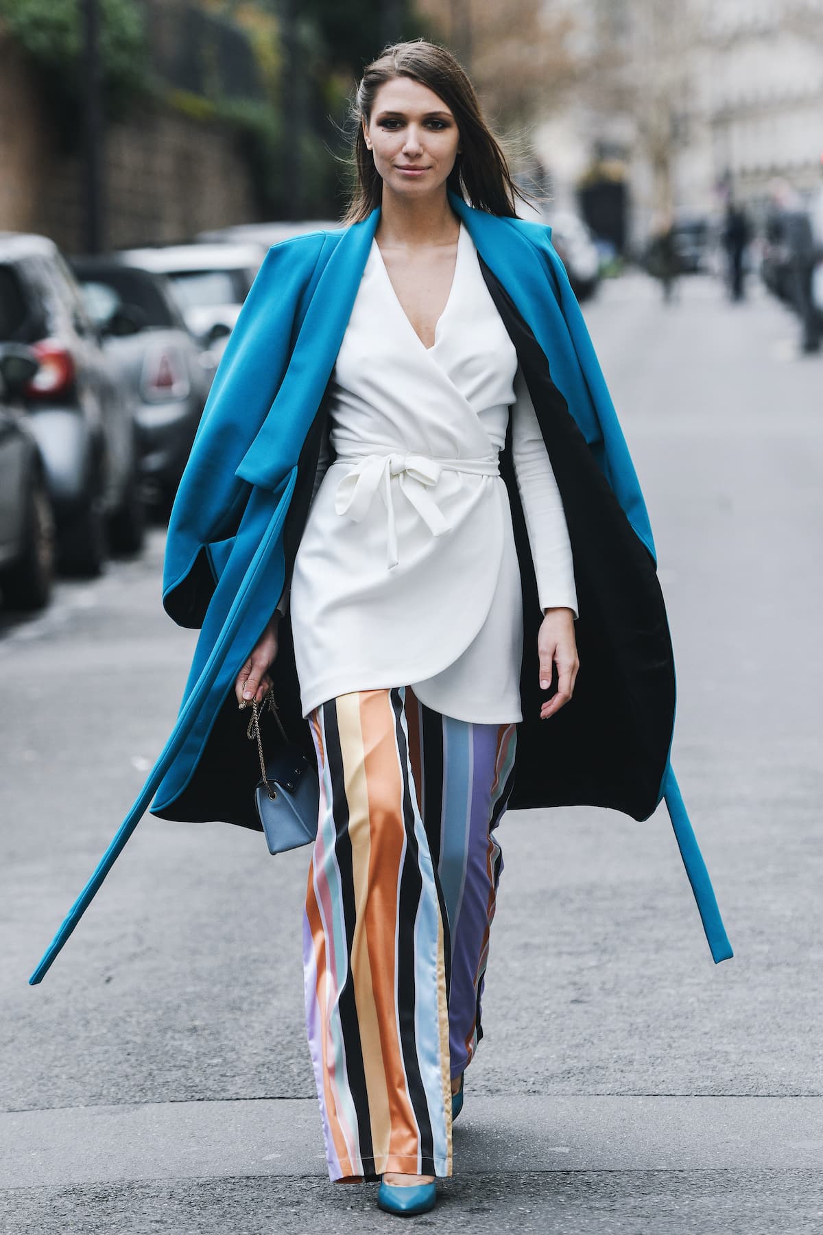 Combina un wrap dress ajustado con unos pantalones acampanados para darle un balance al cuerpo. Como complemento agrega un saco o abrigo de tonalidades similares para no romper con la armonía del outfit.
