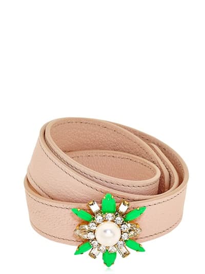 Otra gran forma de lucir un accesorio nude elegante es el cinturón. Puedes combinar un cinturón nude con detalles en brillos súper elegante como este de Shourouk, con unos jeans y una blusa o con una falda larga y un crop top para un look más elegante y de noche.