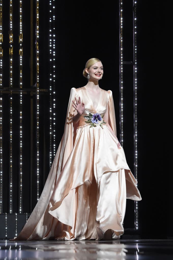 Fanning llamó la atención de las cámaras con un poderoso tono rojo en sus labios, como principal foco de su maquillaje, algo que le dio un aire vintage a todo su atuendo.
