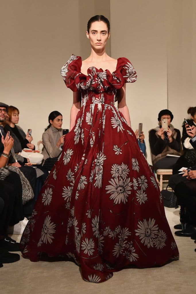 Este dramático, pero elegante vestido rojo quemado con diseño floral pertenece a la colección primavera-verano 2018 de Valentino, la cual se presentó en enero en París.