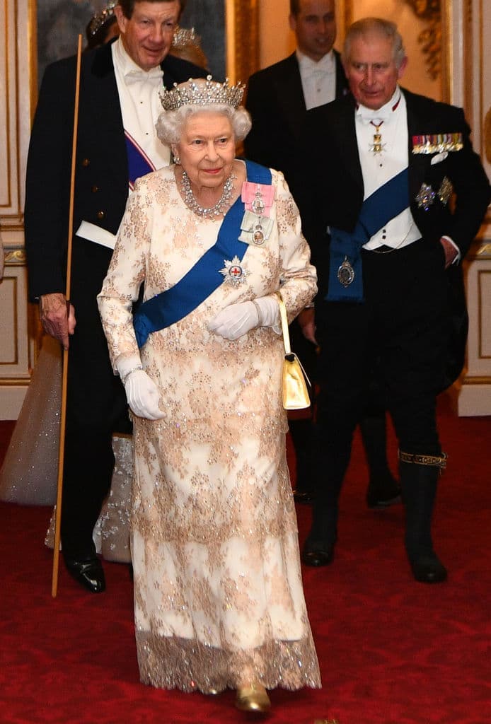La reina no se quedó atrás y lució un vestido lleno de brillo. ¡Está espléndida!