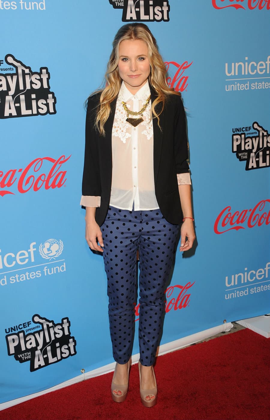 Otra gran opción es incorporar los lunares en los pantalones como hizo la actriz Kristen Bell. Aquí vemos un pantalón azul claro con lunares en negro combinado con una blusa blanca transparente y una chaqueta negra.