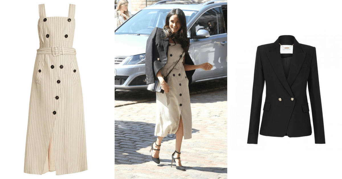 Meghan le dio un giro más moderno a este clásico de Lady Di y usó un blazer de la marca Camilla and Marc en color negro con botones dorados de 550 dólares estadounidenses. El vestido es de la colección Resort 2018 de Altuzarra y está inspirado en los años 80, el modelo cuesta mil 495 dólares.