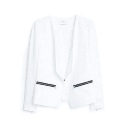 Por si llega a estar fresco no puede faltar un lindo blazer. En este caso el blanco es tu mejor opción ya que combinará con la blusa y ayudará a que resalte el pantalón.