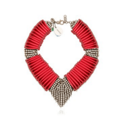 Elige un collar con una forma que luzca bien con el escote en V y en tonos a juego con el outfit. ¡Me encantó este en rojo y dorado!