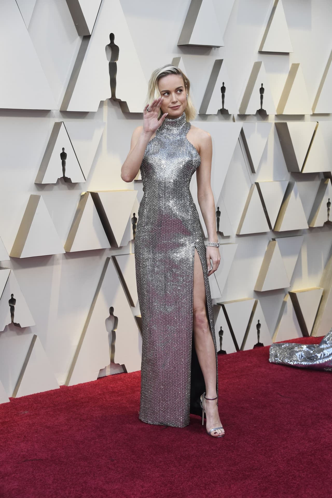 Un derroche de sensualidad. Brie Larson presumió su increíble figura con una ajustada prenda plateada. El cuello alto complementó a la perfección la atrevida abertura sobre su pierna izquierda.