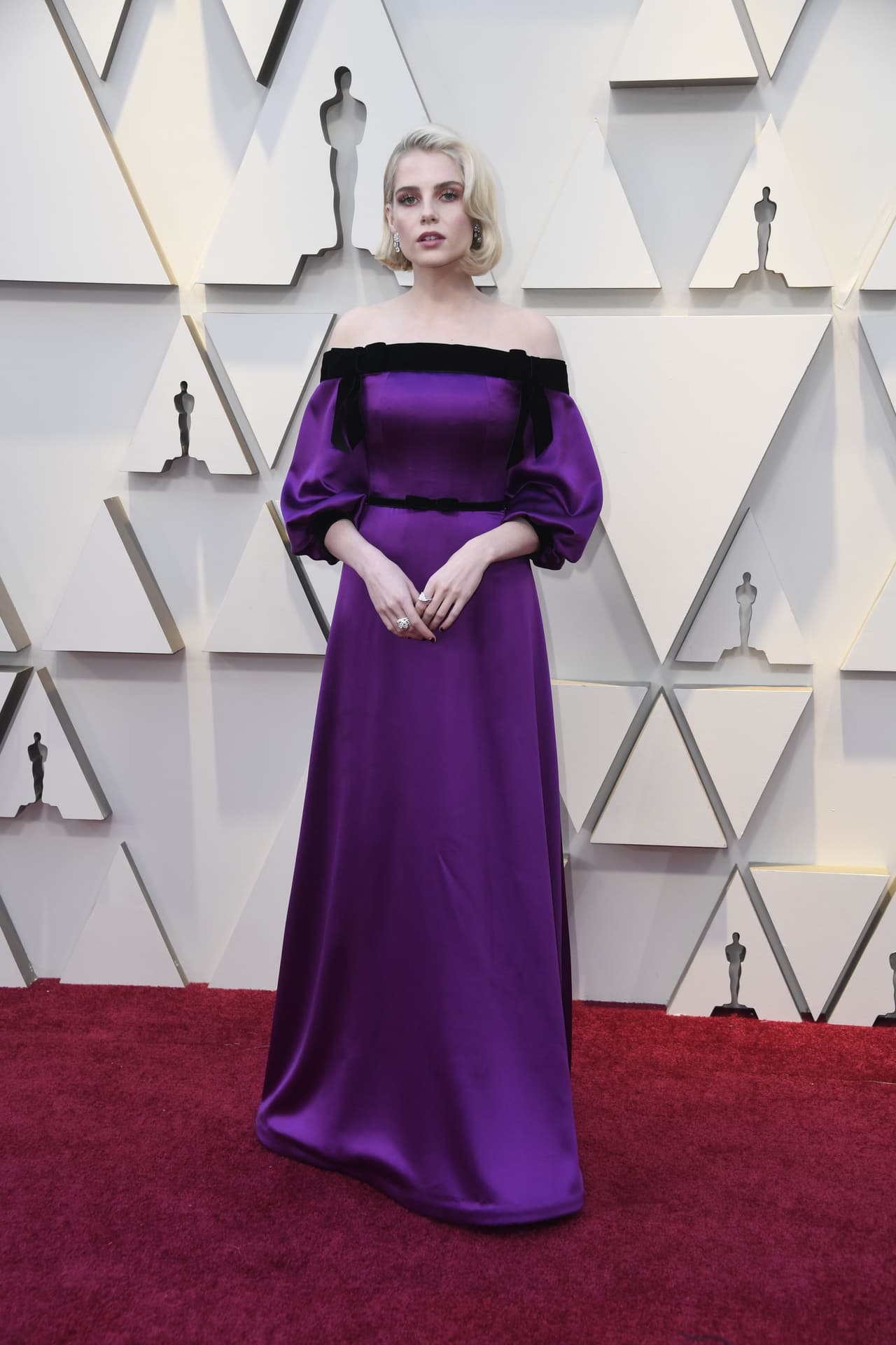 Lucy Boynton tiene un estilo creativo y fuera de lo ordinario. En esta ocasión presentó un look más sencillo, pero no menos hermoso. El color violeta intenso contrastó con el de su piel y cabello. Las mangas abombadas le dieron un aire antiguo, mientras que el cinturón definió su figura.