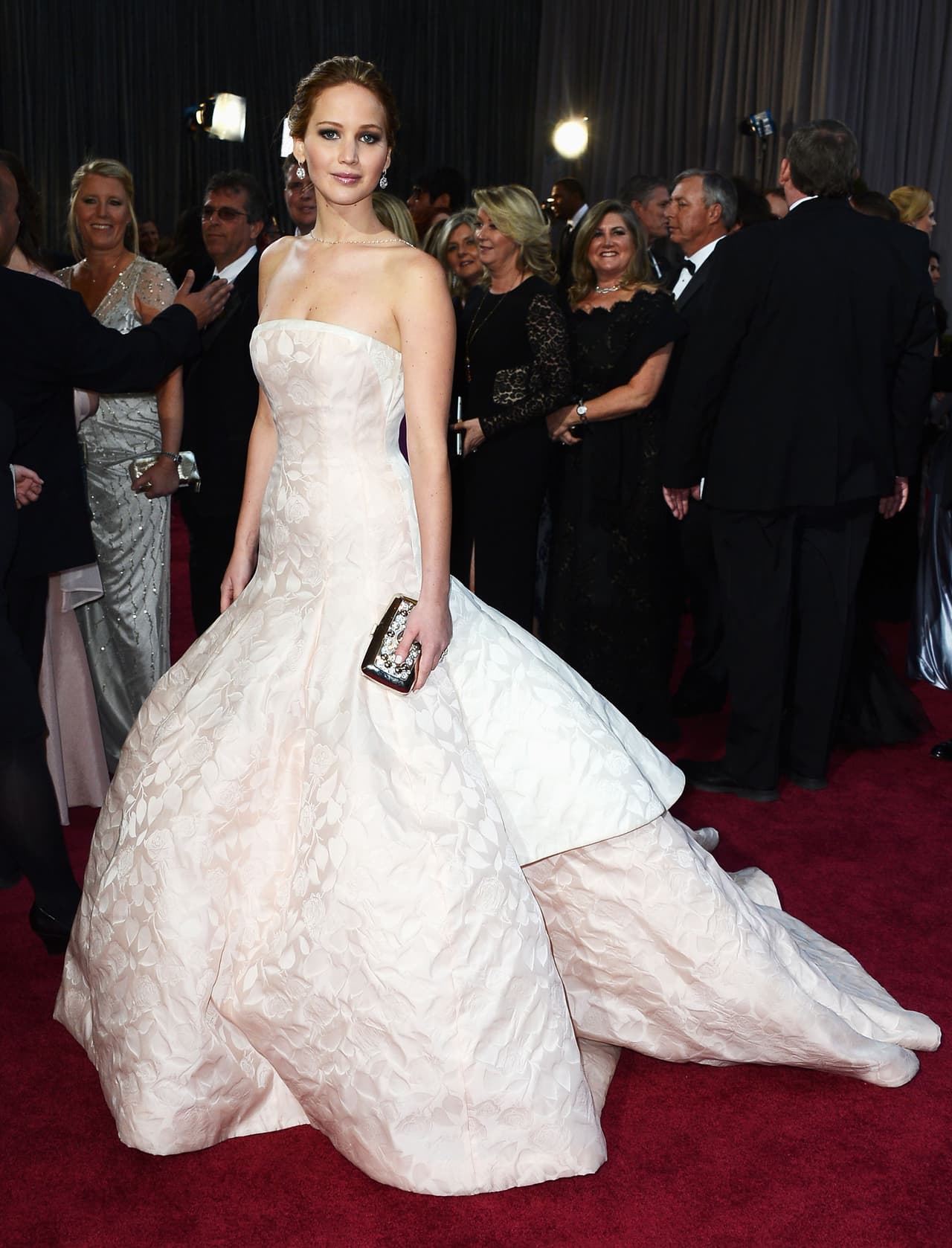 ¿Sabías que este vestido es el más costoso que ha pisado la alfombra roja de los Oscar? Con una gran falda estilo trompeta, este modelo blanco con estampado de flores (también en blanco) fue digno de una princesa moderna.