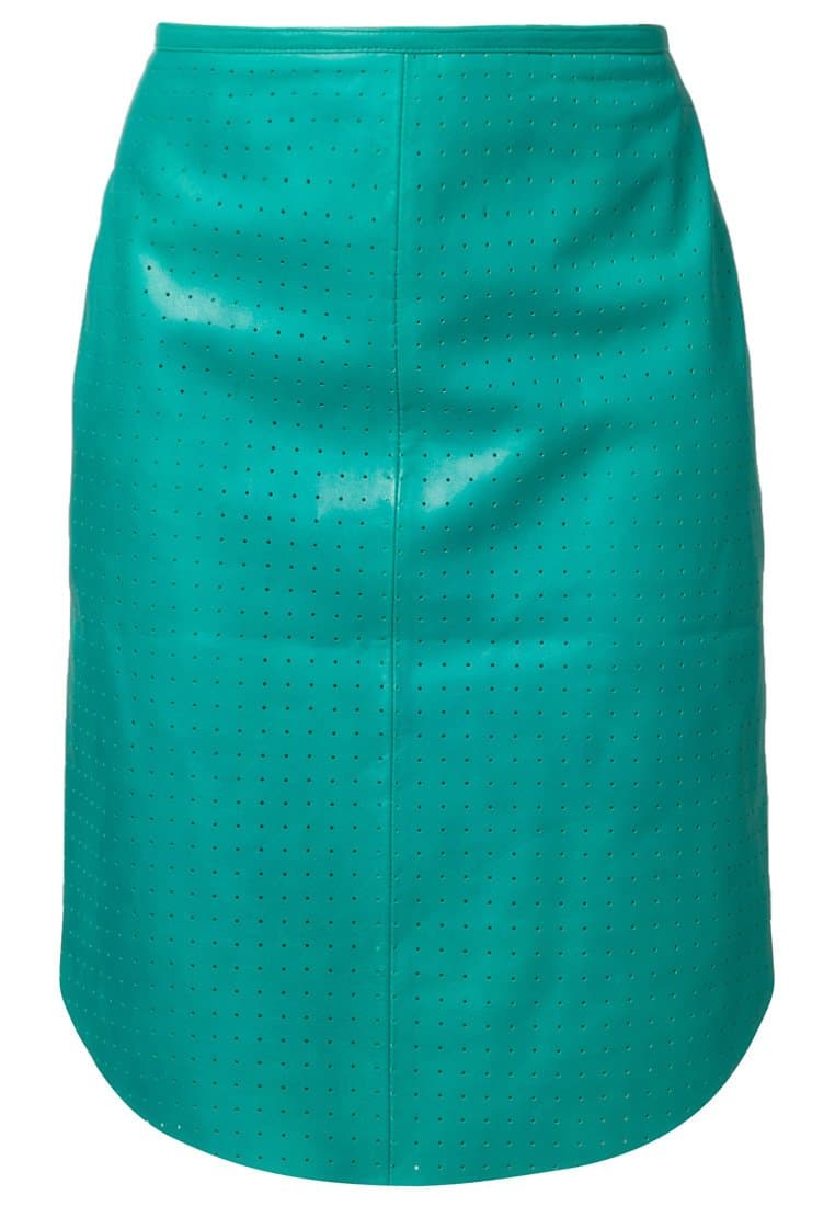 El cuero también continúa siendo tendencia y puedes optar por la clásica falda de cuero negro, o puedes incorporar una falda de cuero colorida como esta verde agua de Villain, que lucirá increíble con una blusa blanca o gris.