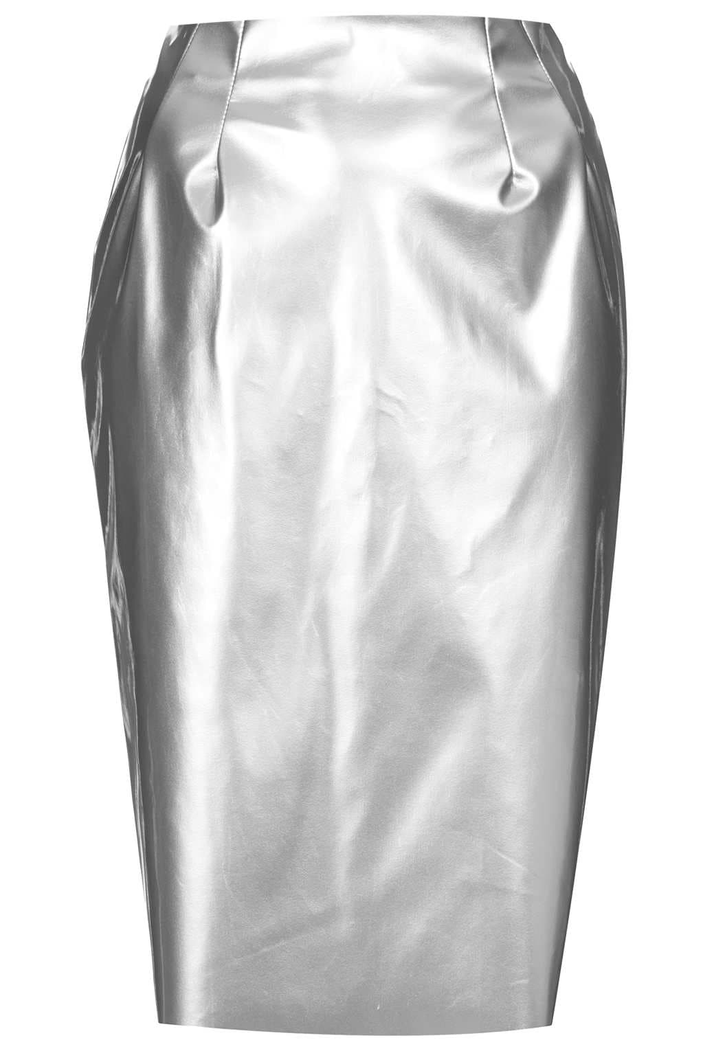 Mira esta falda plateada metalizada de Topshop, una gran adquisición que puedes combinar con diferentes colores.