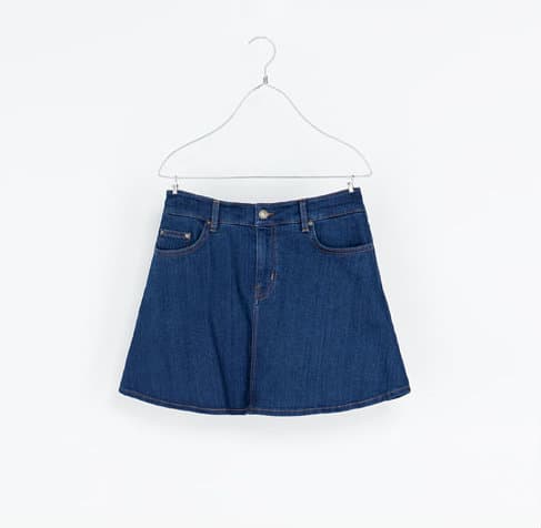 El jean es una gran textura para la falda y si quieres estar a la moda es una gran opción. Como esta falda de jean de Zara.