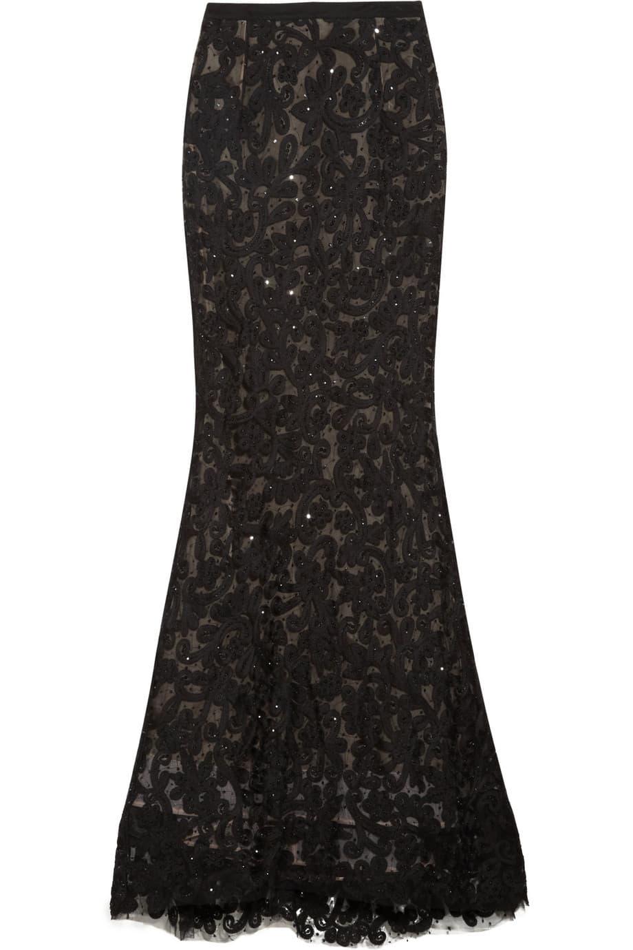 El tul y el encaje son dos grandes tendencias y juntos transmiten elegancia y sofisticación. Ideal para lucir en una velada formal o un evento especial, opta por una falda larga ajustada como esta de Oscar de la Renta y tendrás un look impactante.