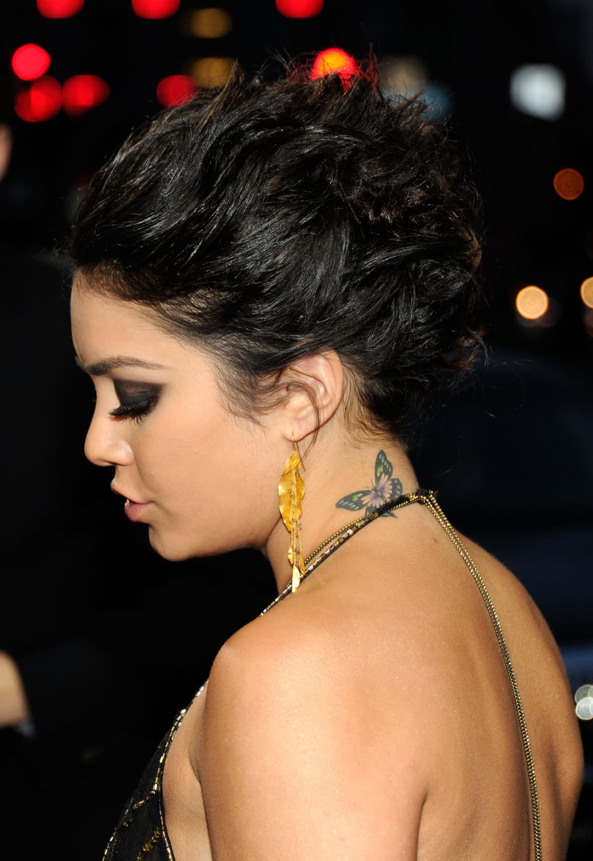 Nada demasiado original, aunque en un lugar muy visible: una mariposa con colores en el cuello es uno de los tattoo de la cantante Vanessa Hudgens. Al igual que Cyrus, también se tatuó el símbolo del ohm, pero ella en los dedos meñiques; y un ojo de horus egipcio en un costado del torso.