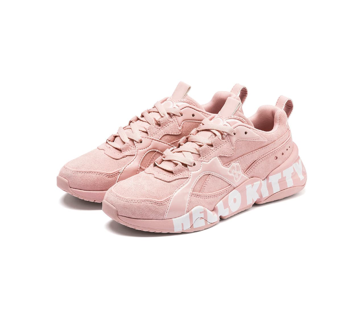 Los Nova Trainers también cuentan con un exterior de gamuza, sólo que un tono rosa mucho más claro. Además, ostentan la tradicional tipografía de Hello Kitty en la media suela.