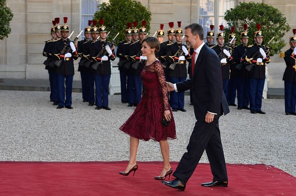 On a special visit to France, King Felipe guides his wife who is wearing a beautiful red dress!