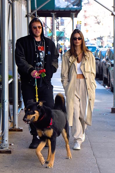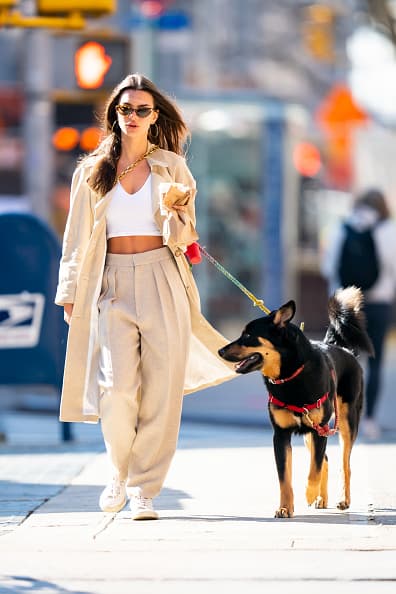 La modelo estadounidense fue vista en las calles de Nueva York acompañada de su esposo, el actor Sebastián Bear-McClard y su mascota. Durante su paseo, Emily lució un confortable outfit compuesto por unos pantalones beige de estilo holgado, con un corte parecido al de los paper bag jeans, y un top blanco que muestra sus famosos abdominales.