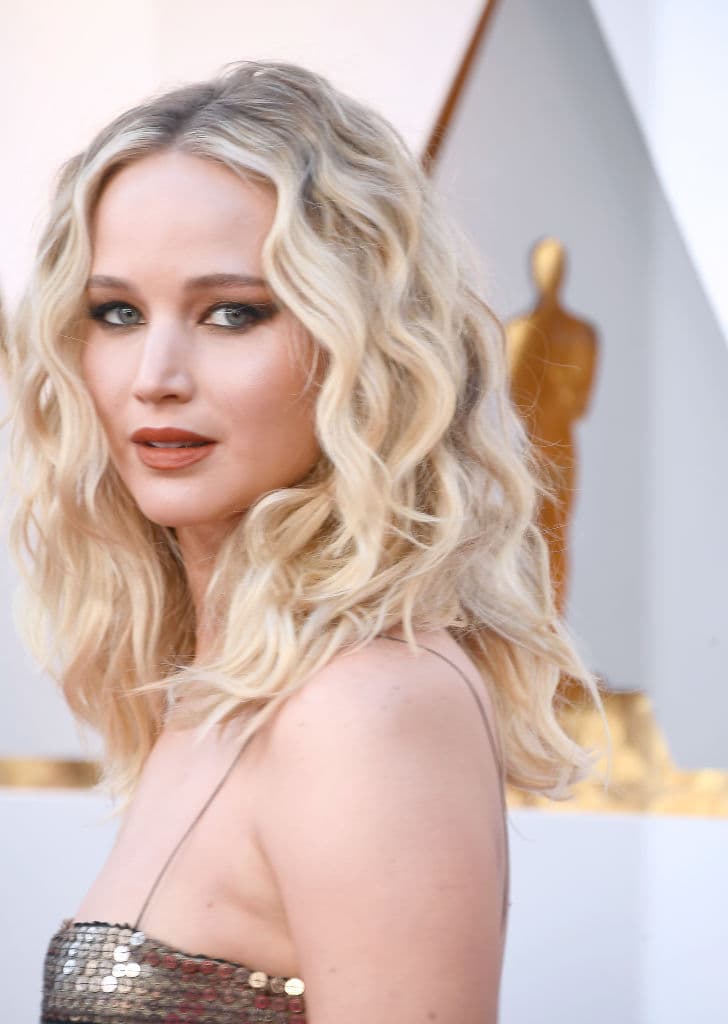 La actriz decidió seguir llevando el cabello corto en un tono rubio más platinado con el que no la habíamos visto antes. El maquillaje, sin embargo, es igual que siempre: sencillo y con un delineado negro profundo para los ojos. En 2015 y 2016, a raíz de sus éxitos, Lawrence fue la actriz mejor pagada del mundo.