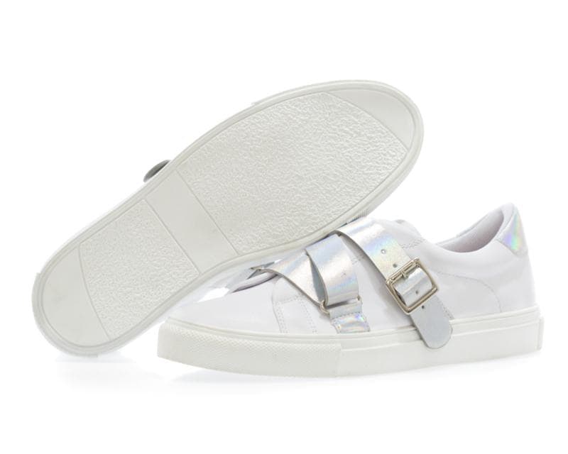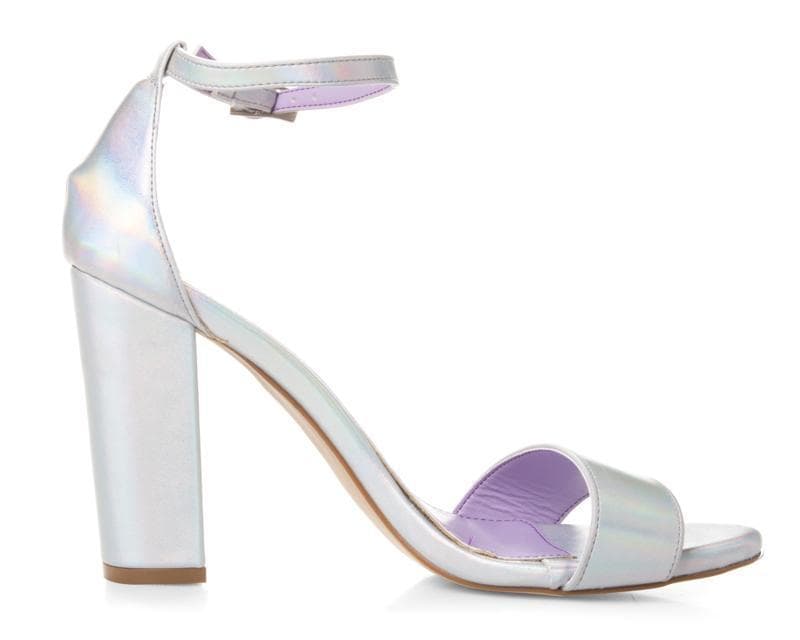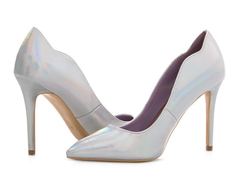 La línea, como se puede ver en la imagen, incluye sandalias de tacón alto (de 10 cm), sandalias bajas, tacones cerrados en punta y tenis, todo con un diseño en común: un color tornasol luminoso.