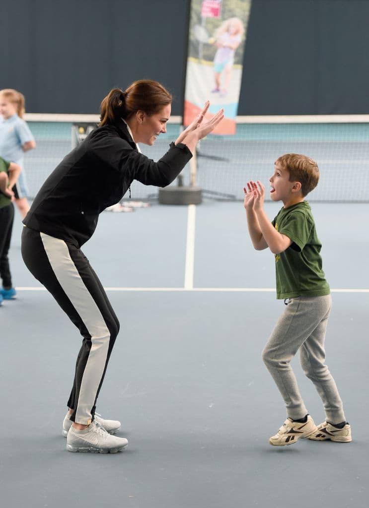 Kate, que está embarazada de su tercer hijo y con hiperémesis gravídica, una rara condición que le provoca náuseas extremas, no se dejó detener por su condición y hasta jugó tennis con los niños del campus.