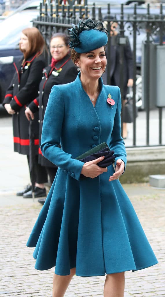 En esta ocasión, Kate lució un vestido abrigo en tono azul de Catherine Walker. Un corte que ya ha llevado en varias ocasiones: ajustado al cuerpo y con falda amplia hasta la altura de las rodillas. Este tipo de abrigo se convirtió en un sello propio, hasta podríamos decir que es una de sus prendas favoritas para los días más frescos.