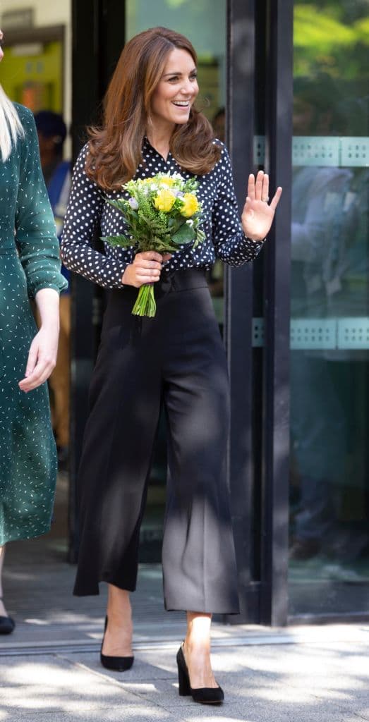 Para la ocasión, la duquesa fue vista en el Hospital Infantil Evelina. Destacó gracias a su atuendo práctico y sencillo, llamando en particular la atención, su blusa estampada en color negro y decoraciones de puntos estilo polka en color blanco.