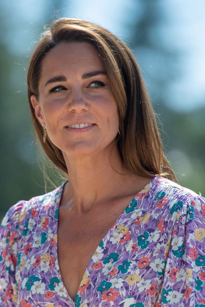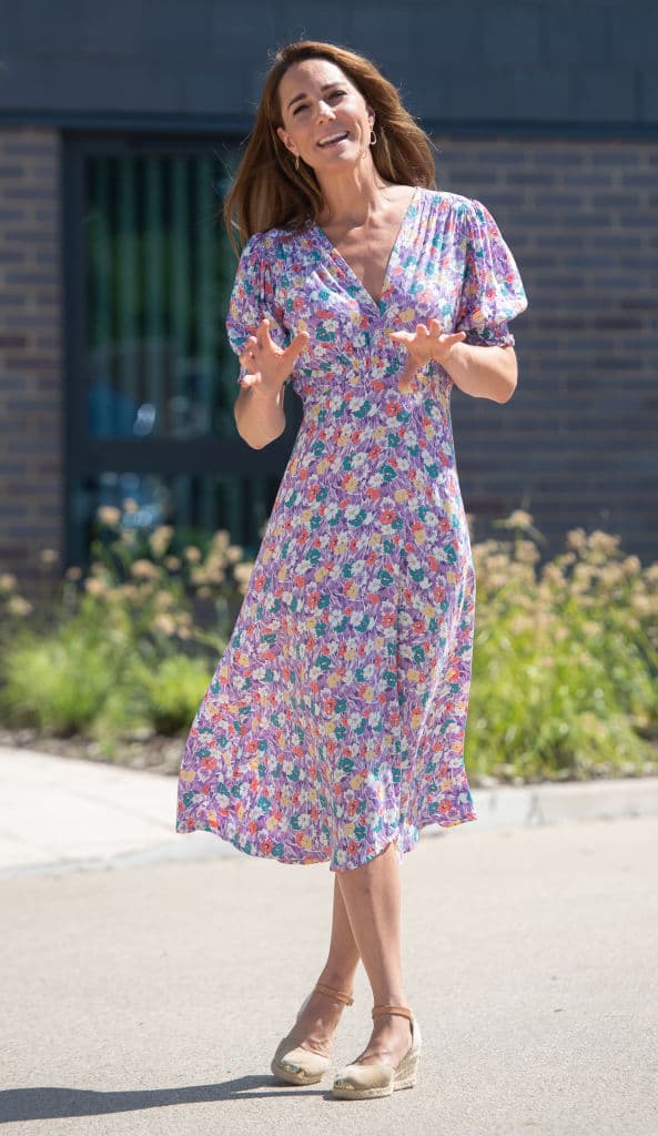 Kate lució un sencillo pero efectivo look para el evento: un vestido ligero en tono lila con cuello v, de largo hasta debajo de las rodillas y estampado de flores en diferentes colores.