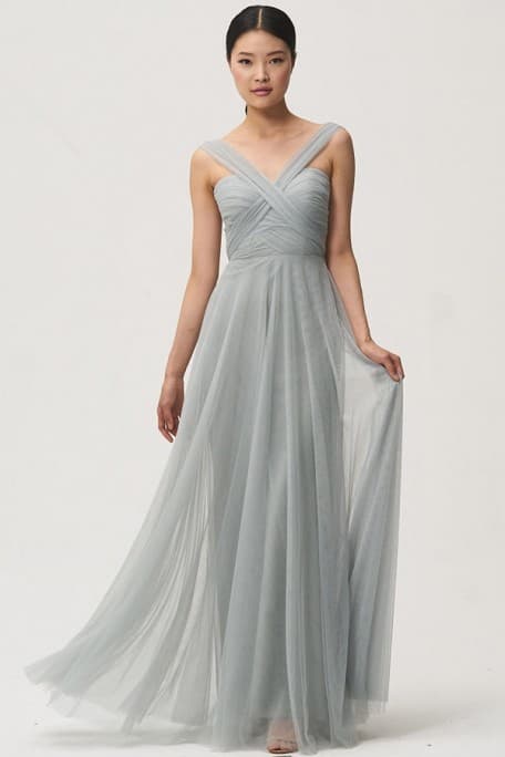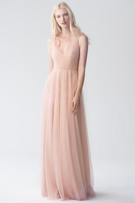 Pero, si el rosa no es tu color, siempre puedes optar por otros tonos claros e igual de lindos. Este modelo de Jenny Yoo es prueba de eso.