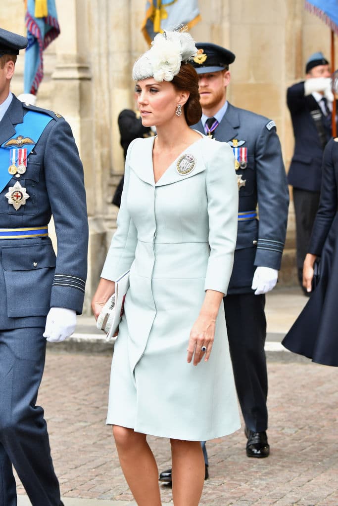 Durante la celebración del centenario de la Royal Air Force, Kate Middleton lució un vestido de su diseñador preferido Alexander McQueen al igual que en muchas otras ocasiones. Sorprende que este vestido parece ser exactamente igual a otros que usó en otros eventos, pero con la diferencia del color.