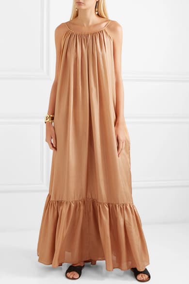 De acuerdo a Harper's Bazaar, este increíble vestido con escote pronunciado en la espalda es de Kalita y lo puedes conseguir online a 392 dólares. El vestido en color terracota pastel cuesta ese precio. No obstante, si optas por el mismo vestido en color naranja brillante puedes gastar hasta 1000 dólares.