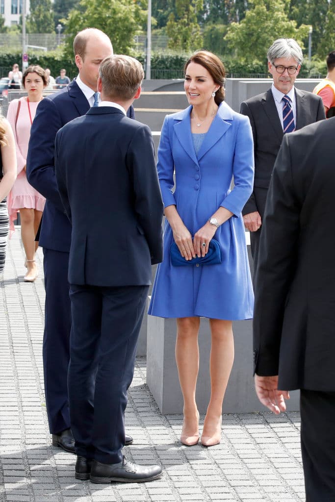 Kate, William, Charlotte y George, todos rindieron homenaje a la cultura alemana con su vestimenta. En el caso de Kate, optó por un diseño azul de la reconocida diseñadora británica Catherine Walker & Co, uno muy similar a los que acostumbraba vestir la princesa de Gales, Diana.