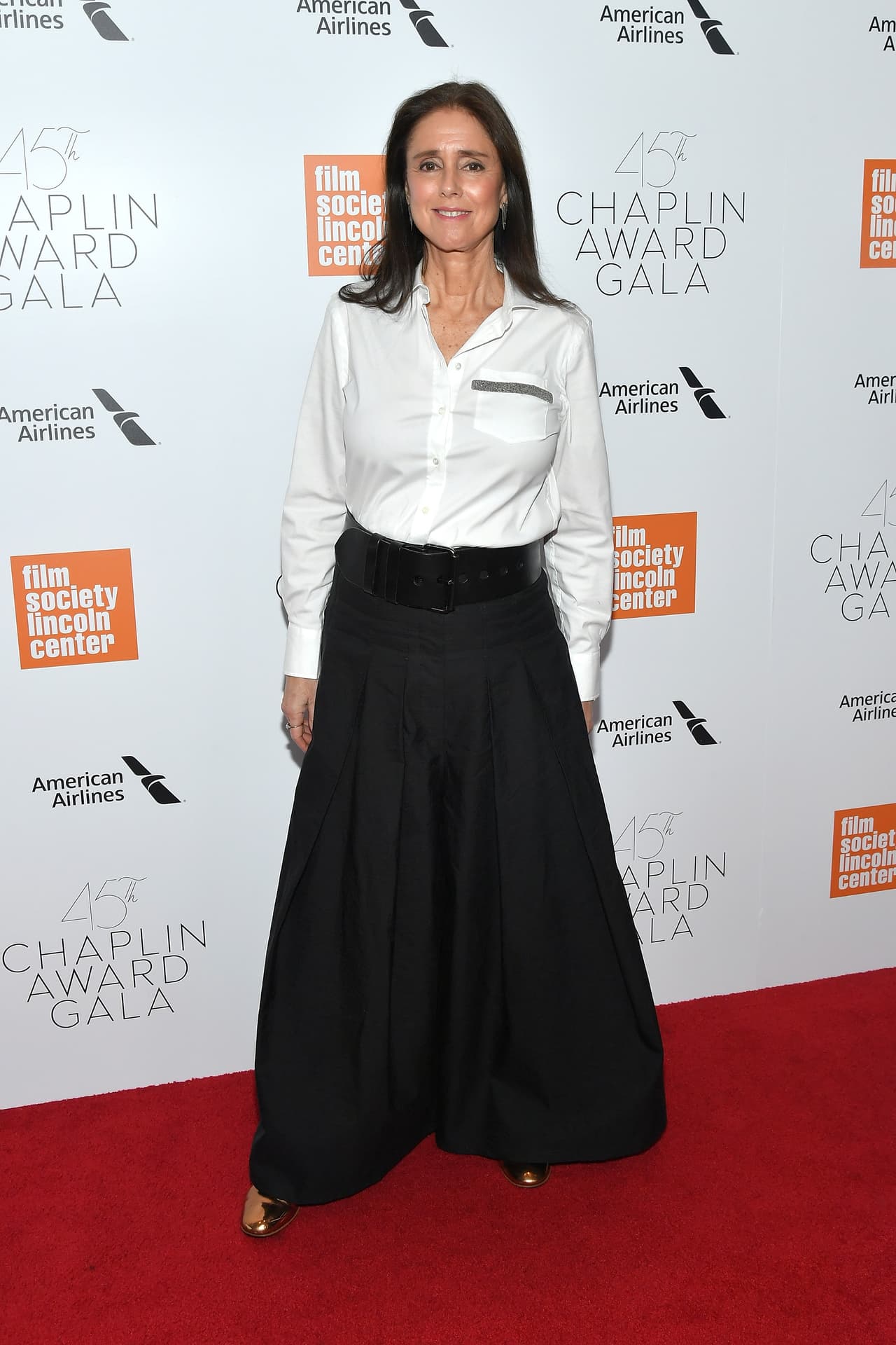 Durante la gala en honor a Charles Chaplin, la directora Julie Taymor optó por un modelo diferente de camisa. Toda cerrada, la pieza sastre tiene un pequeño detalle en negro al lado izquierdo del busto. El detalle no es recomendado para las mujeres que tienen muchos pechos y no buscan hacerlos notar. Para cerrar, una falda negra con cinturón del mismo color que resaltan mejor la figura.