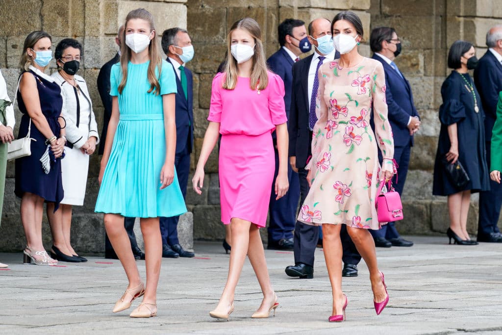 Pero para la ofrenda las hermanas cambiaron colores, la princesa Leonor con un vestido rosa y la infanta Sofía con un look azul turquesa.