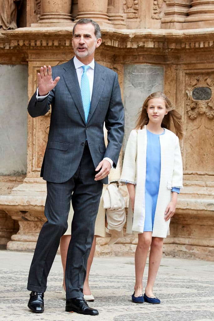 Por su parte, la princesa Leonor quien a sus 13 años es la heredera del trono de España, demostró que sigue los pasos de su madre cuando se trata de estilo, y lució un vestido midi azul que combinó con un saco beige, digno de una auténtica reina.