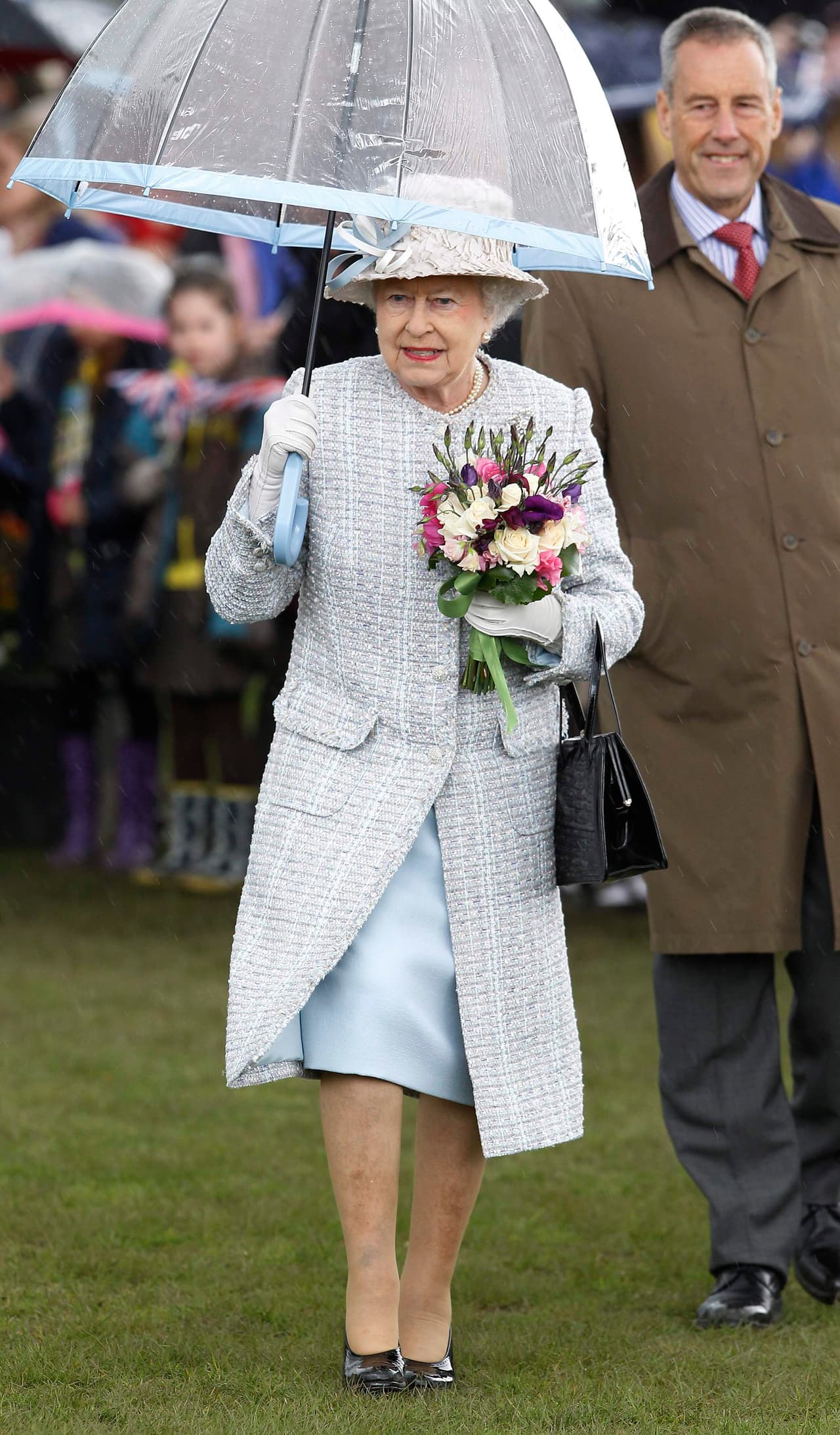 En una fiesta real en el jardín del palacio de Buckingham, la reina lo hizo de nuevo, sus característicos sombrero y gabardina en color amarillo, hicieron juego con su sombrilla con detalles del mismo color.