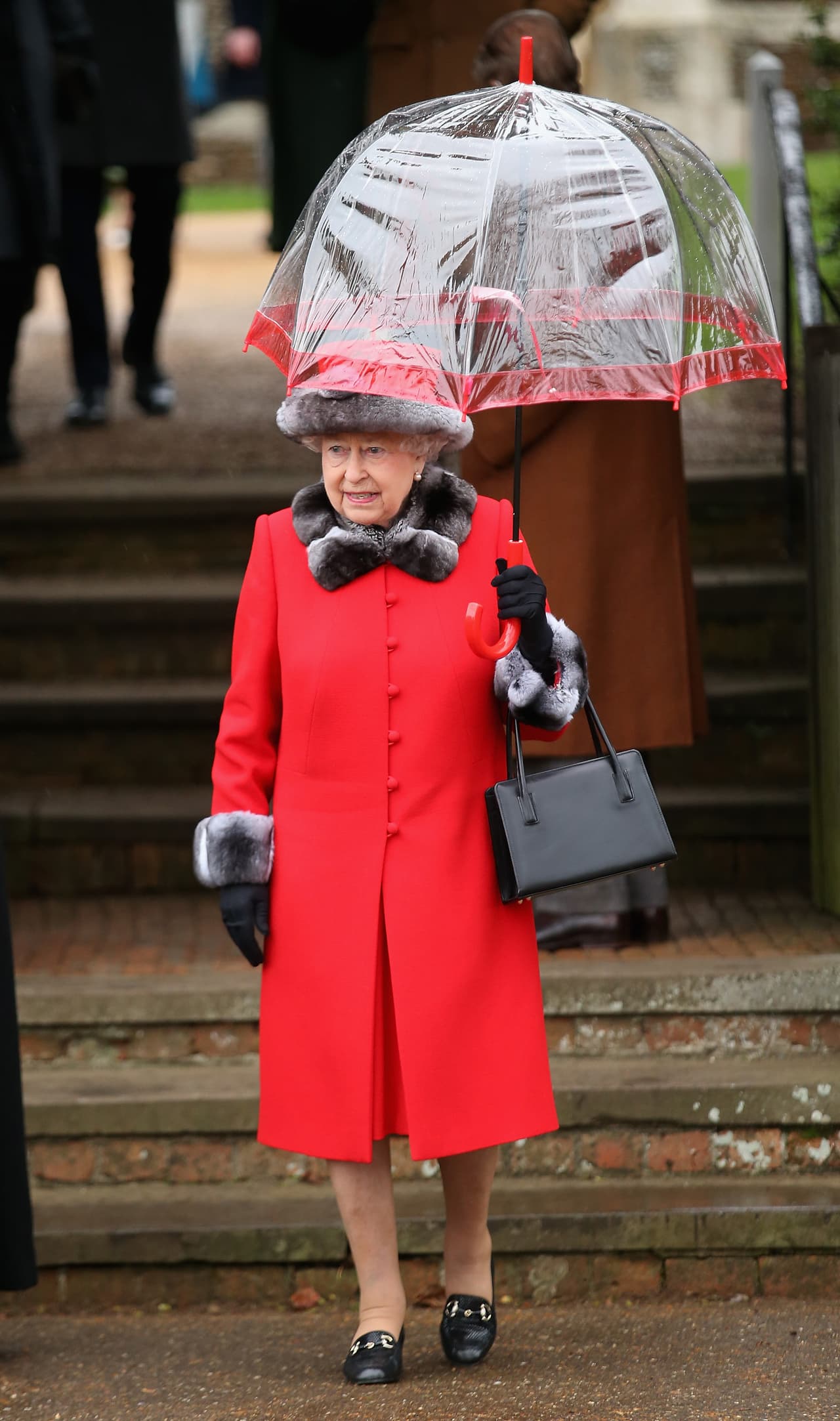 Durante la celebración navideña en 2015, la monarca lució una gabardina sobre un vestido rojo que combinó con su paraguas. Los detalles estuvieron en el mango, la punta y orilla.