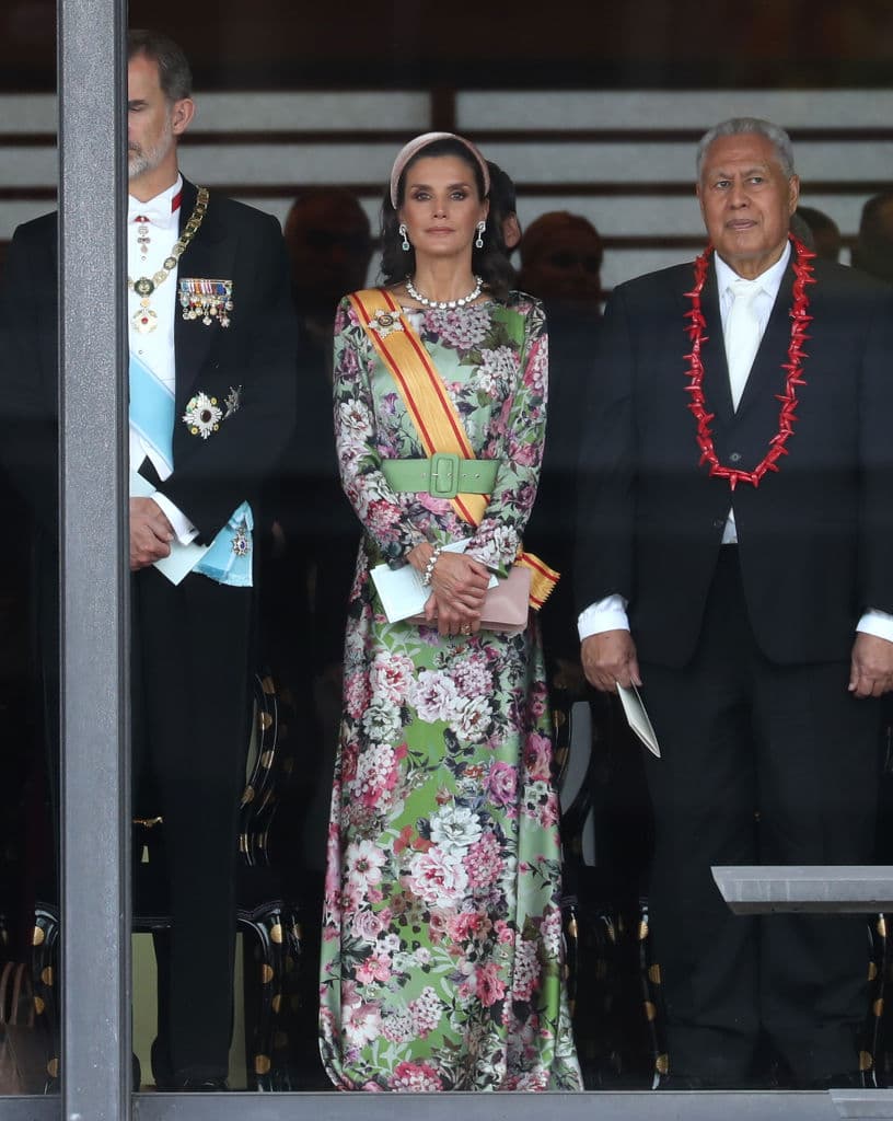No es la primera vez en 2019 que la reina apuesta por tonos y elementos cálidos para resaltar. En Japón, durante la ceremonia de entronización del emperador Naruhito, lució un espectacular vestido de estampado floral.