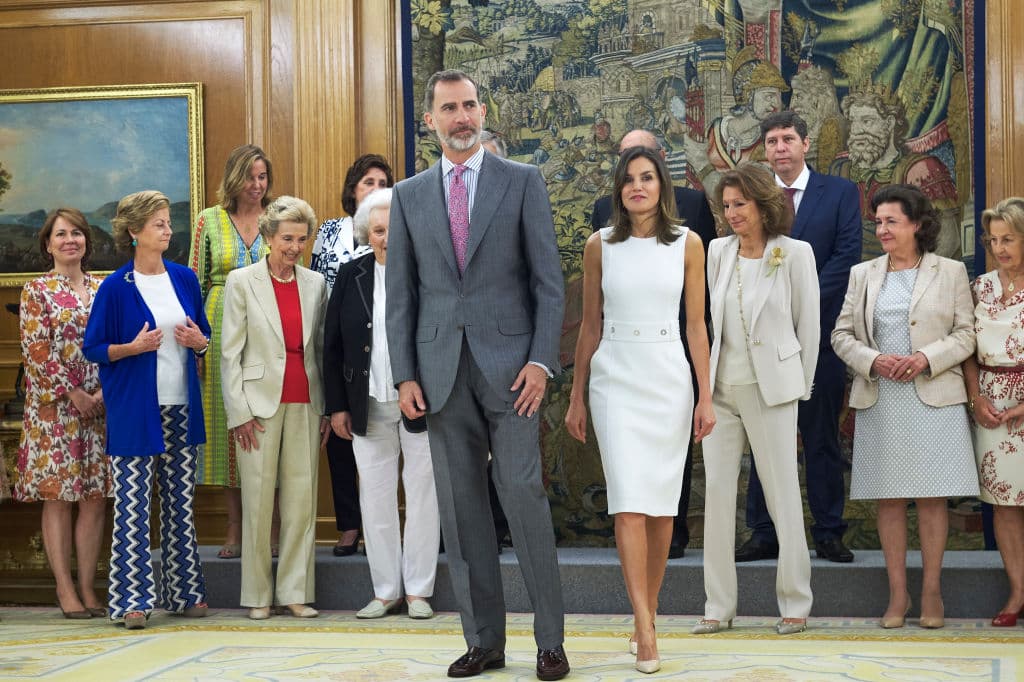La reina Letizia de España asistió a las audiencias del palacio de Zarzuela por el 50 aniversario de la Asociación Nuevo Futuro con un vestido blanco, con un cinturón y sin mangas que puede ser perfecto para cualquier novia.