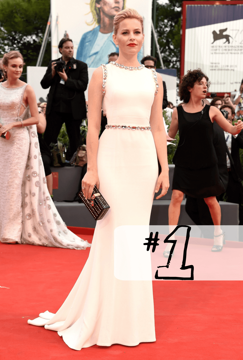 Siguiendo la tendencia minimalista, la actriz Elizabeth Banks lució increíble con un vestido blanco de Dolce & Gabbana al cuerpo con detalles en brillos y una espalda soñada con moños negros.