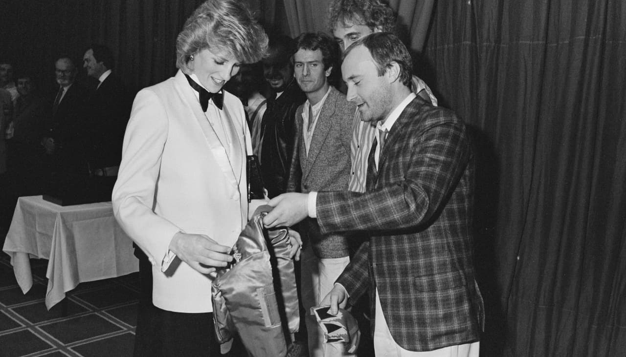 Un concierto de caridad con invitados como el cantante Phil Collins y la banda de rock Genesis, fueron el escenario perfecto para que Lady Di luciera un esmoquin de manera magistral.