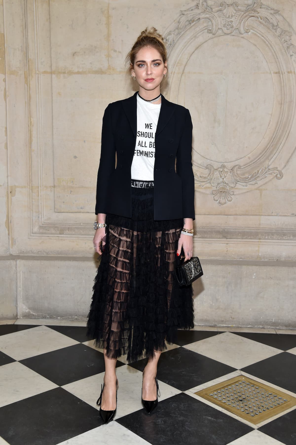 La intérprete de ‘Bella traición’ apostó por un look total black, compuesto por una playera con la frase 'We should all be feminists', un sombrero y una maxi falda transparente con estampado blanco.